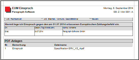Der Druck für den Handakt entspricht dem Formblatt F des Europäischen Mahnverfahrens.
