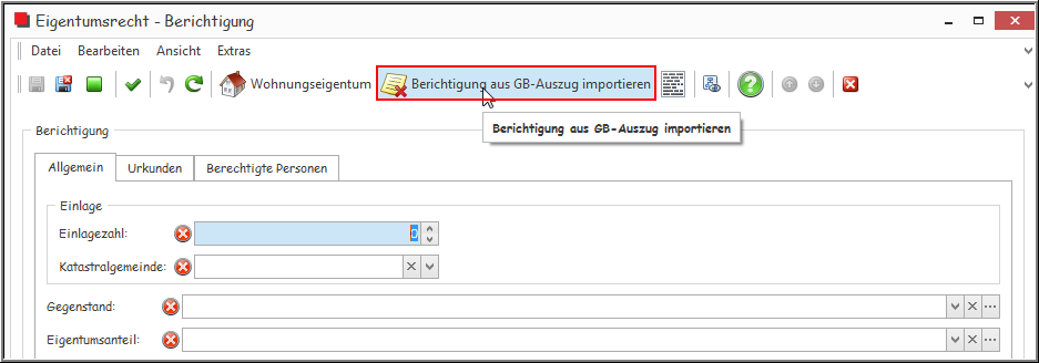 Wollen Sie mehrere/alle Anteile, die derzeit im Grundbuch einverleibt sind, berichtigen (Parifizierungsgutachten, neues Nutzwertgutachten), starten Sie, bevor sie Daten für die Berichtigung eingeben, den Grundbuchassistenten mit "Berichtigung aus GB-Auszug importieren".