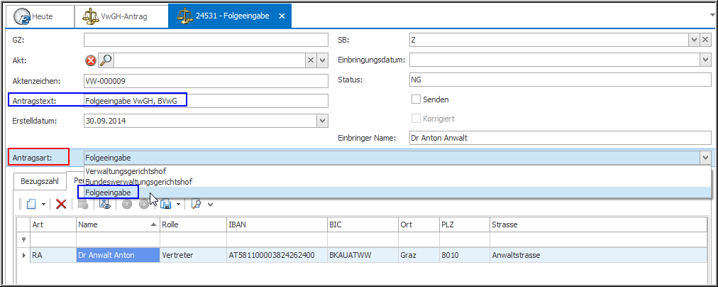 Um eine Vorlage für die Folgeeingabe (an Verwaltungsgerichtshof und Bundesverwaltungsgericht) anzulegen, führen Sie aus der Vorlage für die Ersteingabe (Egal ob an VwGH oder BVwG) mit dem entsprechenden Einbringer einen Antrag aus (Vorlage- Von Vorlage übernehmen) und stellen im ausgeführten Antrag bei der Antragsart auf "Folgeeingabe". In den Antragstext schreiben Sie beispielsweise "Folgeeingabe VwGH, BVwG".