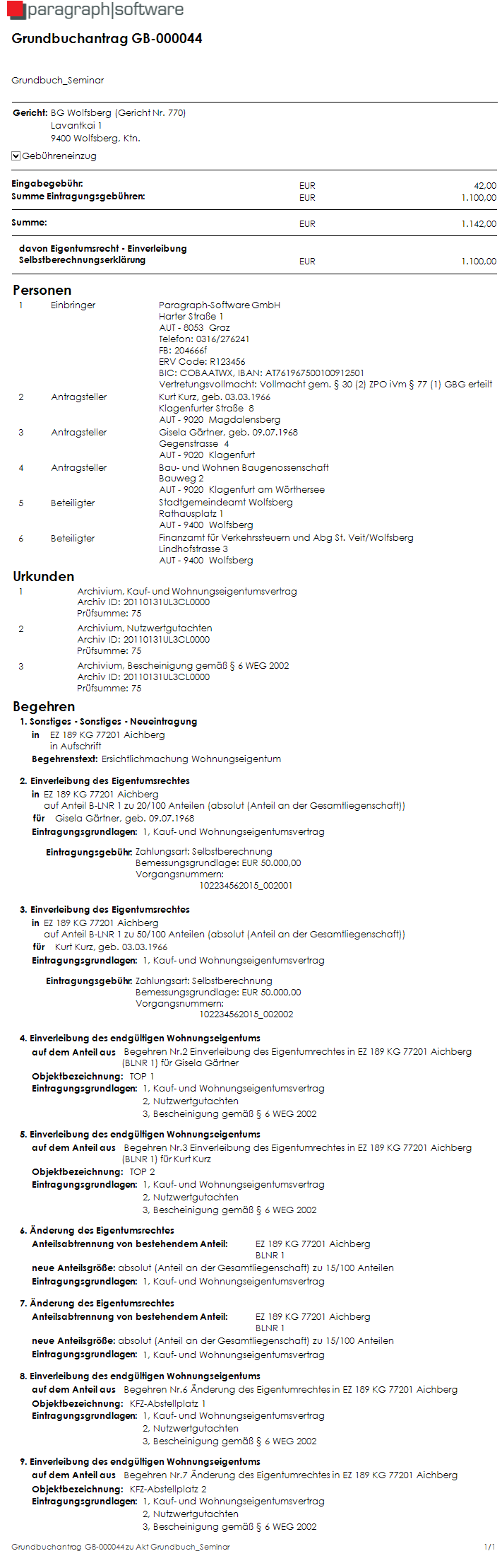 Gisela Gärtner, geb. 02.02.1955 und Kurt Kurz, geb. 03.03.1966 beantragen die Einverleibung des Eigentumsrechtes samt Einverleibung von Wohnungseigentum (Gisela Gärtner an 20/100-Anteile und WEG TOP 1 und Kurt Kurz an 50/100 Anteile und WEG TOP 2), die bisherige Eigentümerin Bau- und Wohnen Baugenossenschaft beantragt die Teilung ihrer verbleibenden Anteile (30/100) an denen ebenfalls Wohnungseigentum begründet wird (KFZ-Abstellplatz 1 (15/100 Anteile) und KFZ-Abstellplatz 2 (15/100 Anteile)