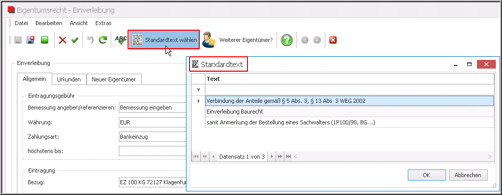 Für die Sonstige Neueintragung gibt es zahlreiche Standardtexte für den Begehrenstext. Diese Liste können Sie individuell erweitern.