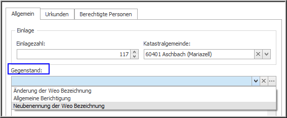 Folgende Gegenstände bzw. Arten der Berichtigung stehen alternativ zur Auswahl: