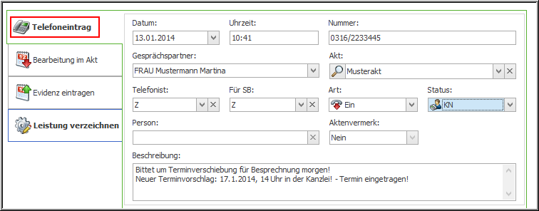 Zusätzlich finden Sie ein Textfeld für die Beschreibung des Telefonats, die Personen (wer hat telefoniert und für wen war das Telefonat), die Art, die Telefonnummer und den Status.