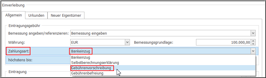 Im Begehren selbst wählen Sie bei der Zahlungsart für die Eintragungsgebühr entweder Bankeinzug oder Gebührenvorschreibung. Bei Auswahl Bankeinzug ermäßigt sich die Eintragungsgebühr um EURO 20,-- (Anm. 6 zu TP9 lit b Z 1,3 GGG).