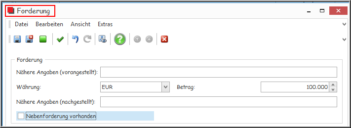 Neben dem Forderungsbetrag und der Währung gibt es noch zwei Zusatzfelder (dem Forderungsbetrag vorgestellt bzw. nachgestellt), in denen per Freitext nähere Angaben zum Forderungsbetrag gemacht werden können (Beispiel: Leibrente monatlich, Kaufpreisforderung u.Ä.)