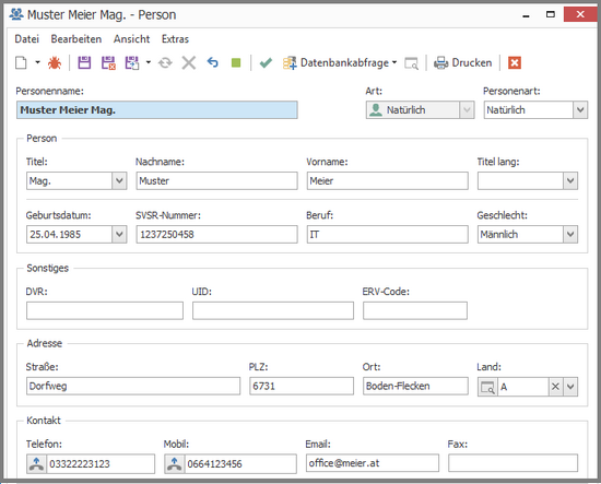Wählen Sie die Personenart aus und geben Sie die Parameter ein. Mit Speichern und Schließend schließen Sie die Personenanlage ab.