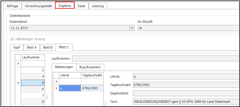 Wird (vorab) aus den Hilfsverzeichnissen abgefragt (etwa Personenverzeichnis, Anschriftenverzeichnis, Grundstücksverzeichnis) ist das Ergebnis eine Ergebnisliste. Aus dieser Liste können direkt, wenn zutreffend, weitere Abfragen erstellt werden. (Z.B. Abholen einer Urkunde zu einer Tagebuchzahl, Abfragen einer EZ zu einer Adresse oder einer Grundstücksnummer).