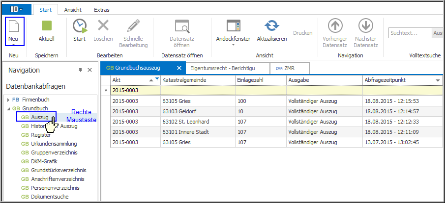 Für einen (allgemeinen) Grundbuchauszug stellen Sie sich in der Navigationsleiste Datenbankabfragen/Grundbuch/Auszug und starten einen neuen Grundbuchauszug entweder über die Schaltfläche "Neu" oder direkt aus der Navigationsleiste mit Rechter Maustaste.