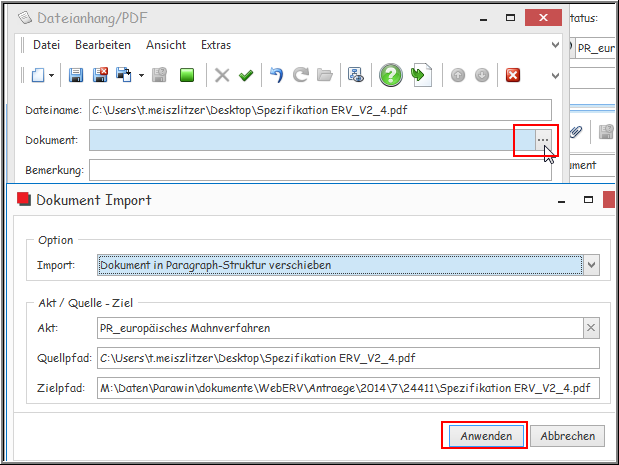 Sie können Dokumente direkt aus dem Akt, oder aber von jedem beliebigen Speicherort in den Antrag übernehmen.